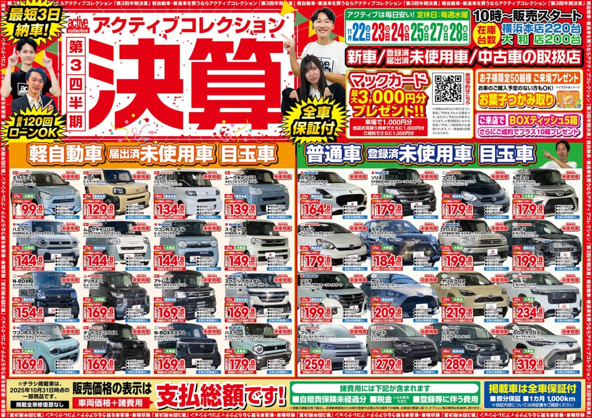 【チラシ更新】11月22日~11月28日は、アクティブコレクション第3四半期決算!最短3日納車!全車保証付!最長120回ローンOK!!